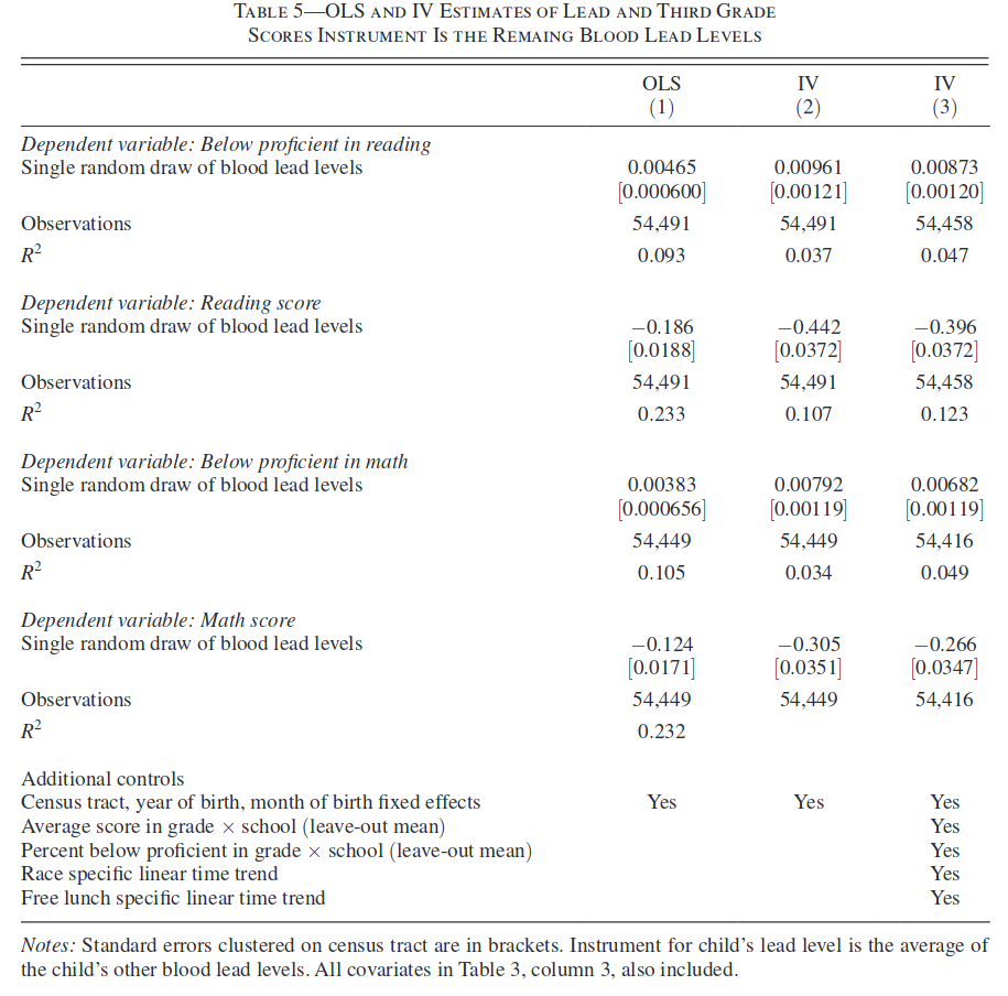 where \(test_i\) is a 3rd grade reading or math test and \(lead_i\) is a blood lead level measurement taken before the age of six. Some children had multiple measurements of their blood lead levels taken. Each blood lead level measurement has some error. In comparing columns (1) and (2), note that venous tests are known to have less measurement error than capillary tests, and in comparing columns (3) and (4) the average of all blood lead levels has less measurement error than a single one. Are the changes in the estimates across columns what you would expect from part part 1? Why or why not?