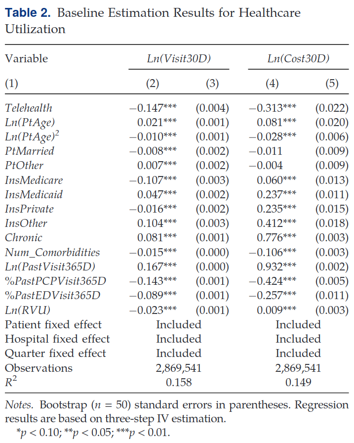 In “Impact of Telehealth and Process Virtualization on Healthcare Utilization” Ayabakan, Bardhan, and Zheng (2024) study the impact of telehealth visits on subsequent healthcare utilitization. They estimate the following linear model: \[ Util_{iht} = \beta_1 Telehealth_{iht} + \beta Controls_{iht} + \theta_i + \varphi_h + \lambda_t + \epsilon_{iht} \] where \(Util_{iht}\) is a measure of healthcare utilization in the next 30 days (either number of visits or cost), \(Telehealth_{iht}\) is an indicator for whether the initial visit was via telehealth or in-person, \(\theta_i\) are patient fixed effects, \(\varphi_h\) are healthcare provider fixed effects, and \(\lambda_t\) are time (quarter) fixed effects. Controls include patient medical history and provider characteristics.